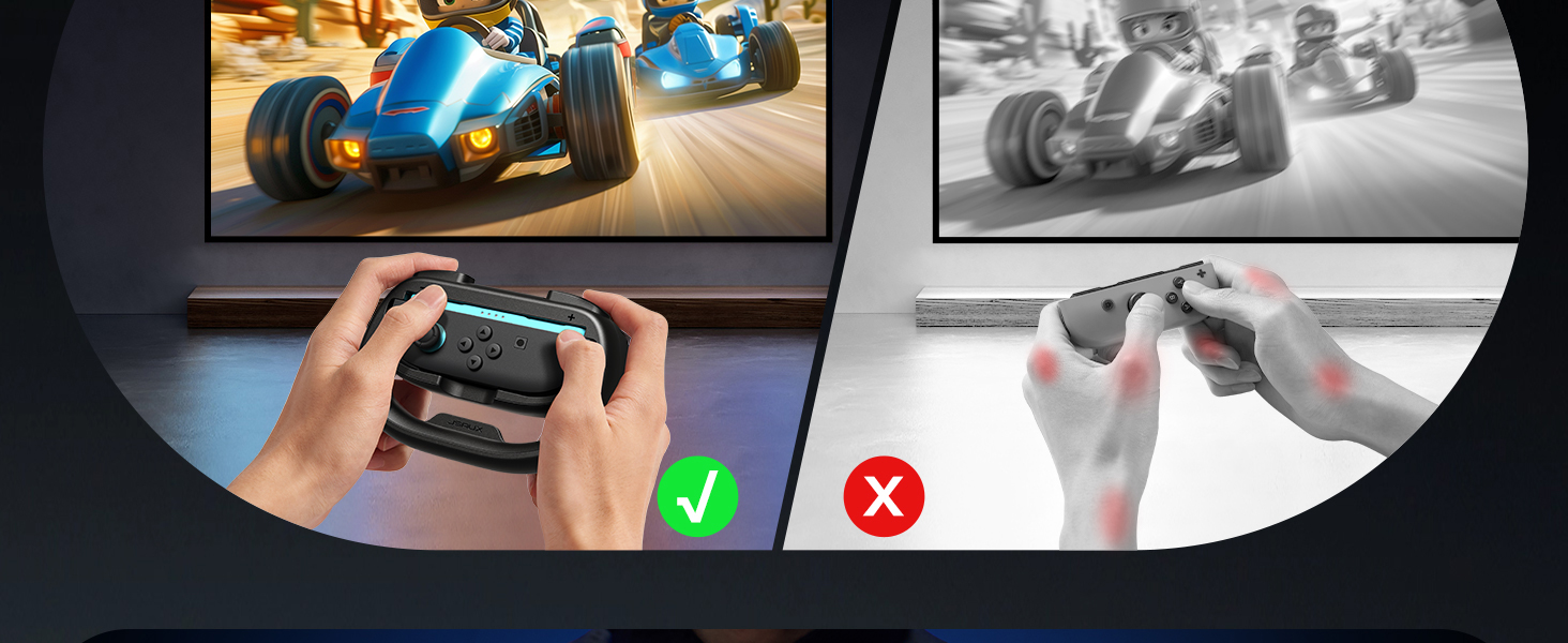 The steering wheel is ergonomically designed to provide a comfortable grip. The SL and SR buttons respond quickly, delivering an excellent gaming experience. The anti-slip texture protects your JoyCon controller from slipping, allowing you to enjoy long gaming sessions comfortably. It also extends the lifespan of your JoyCon Controller
