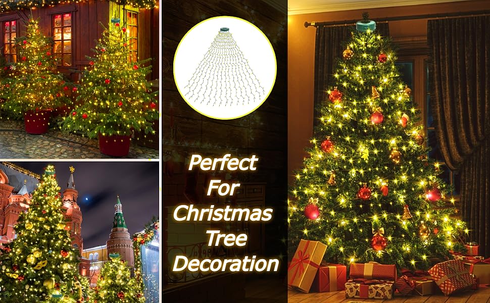 【Reasonable Design, Easy to Install】The Christmas decor light has 16 light strings, each line is 6.6ft (2m) long and equipped with 25 LEDs, a total of 400 LEDs. There is a mounting ring on the top of the Christmas lights, just fix the ring on the top of the Christmas tree and let the 16 string lights hang down from the tree to finish installation. The 16.4ft(5m) power cord allows you to place the tree lights anywhere, let the lights illuminate whole room to enjoy a wonderful fairy light show!