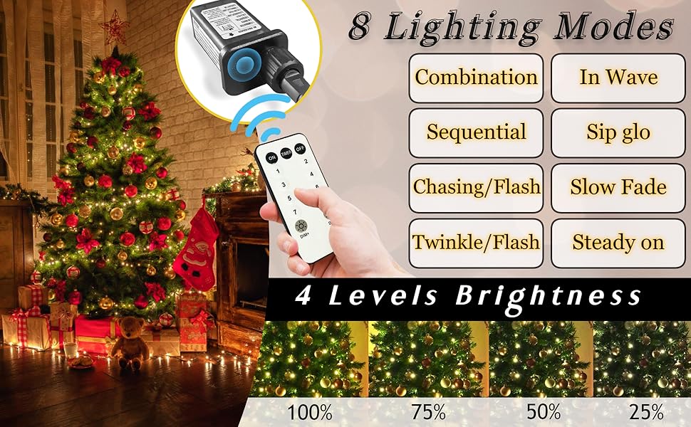【8 Lighting Modes & 4 Levels Brightness】aneeway Christmas tree lights are available in 8 different lighting modes(Use remote control or press the button on the plug to switch the light modes). And the string lights have 4 levels of brightness (25%, 50%, 75%, 100%) for choice. A variety of blinking modes and brightness bring different light effects, which will make your Christmas tree and holiday more atmospheric!